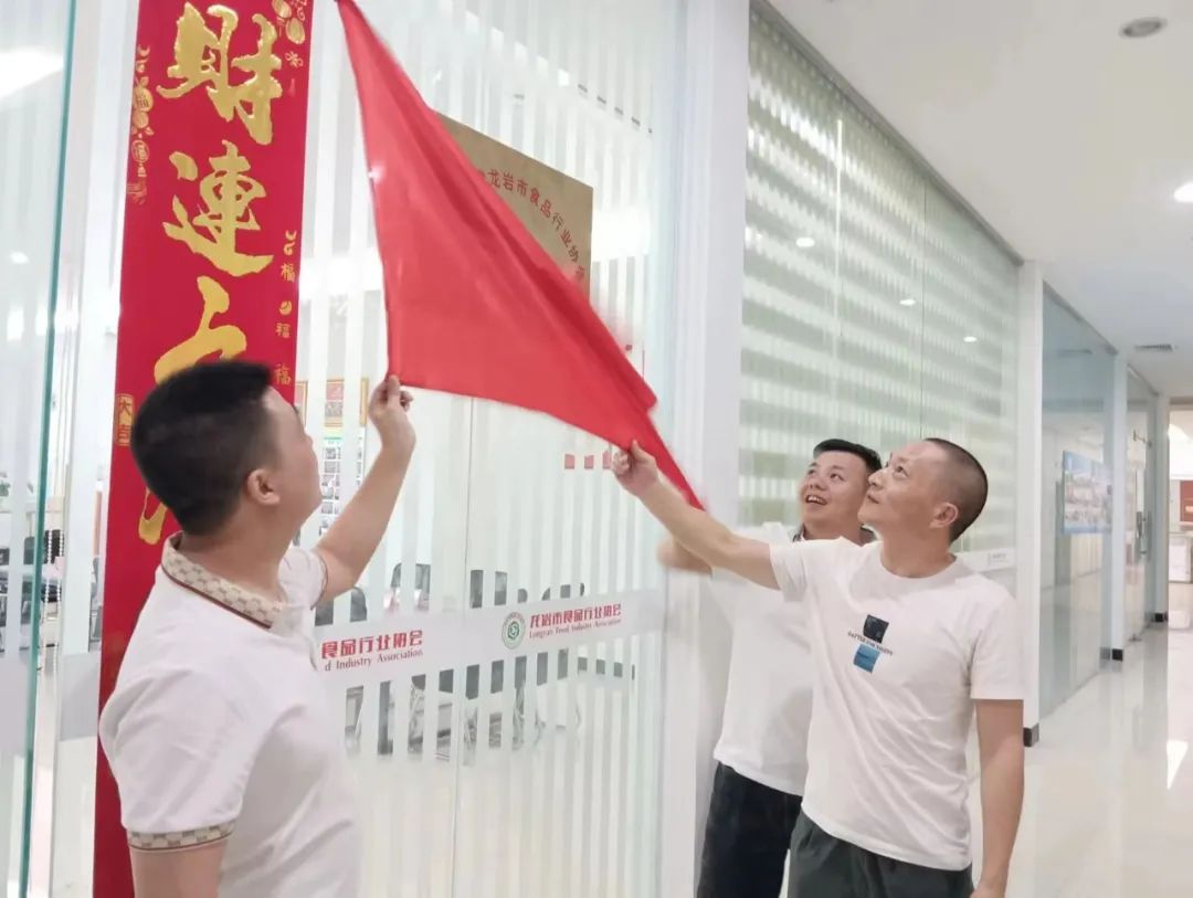 龙岩市食品行业协会支部书记赖福滨(左一),新罗区龙州经济发展中心委员会党委委员、中心副主任廖国庆(中间)、会长叶名松(右一)