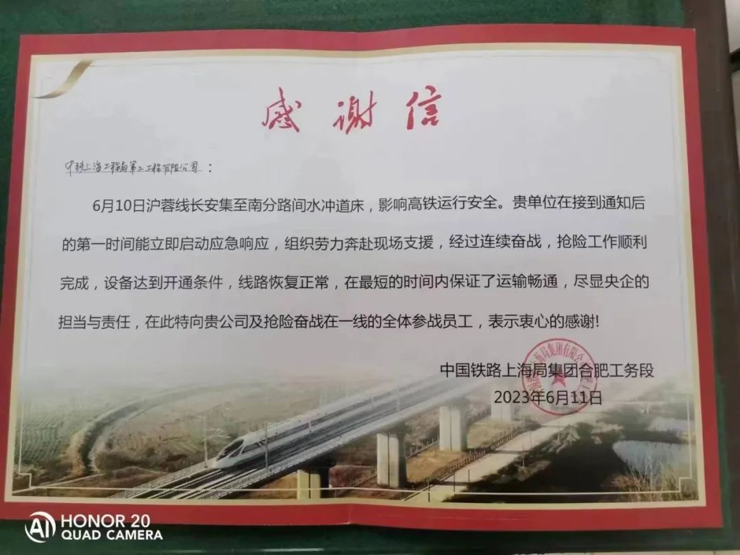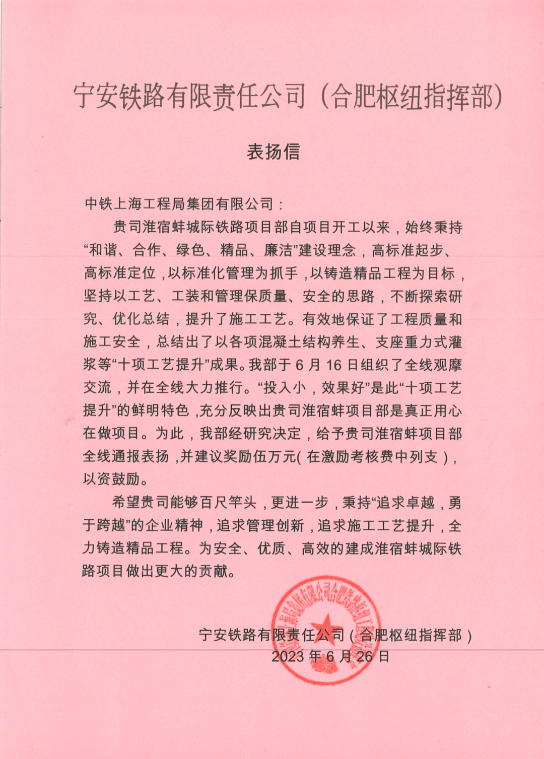 宁安铁路有限公司(合肥枢纽指挥部)发来表扬信