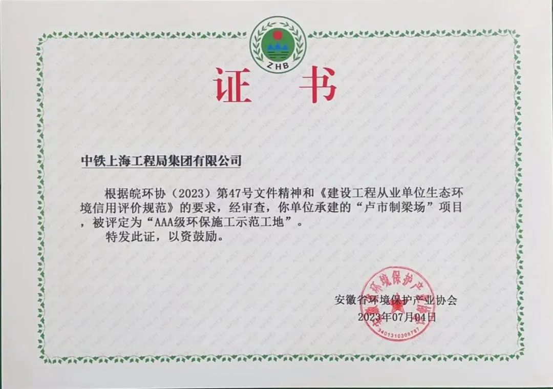 卢市制梁场获“AAA级环保施工示范工地”称号