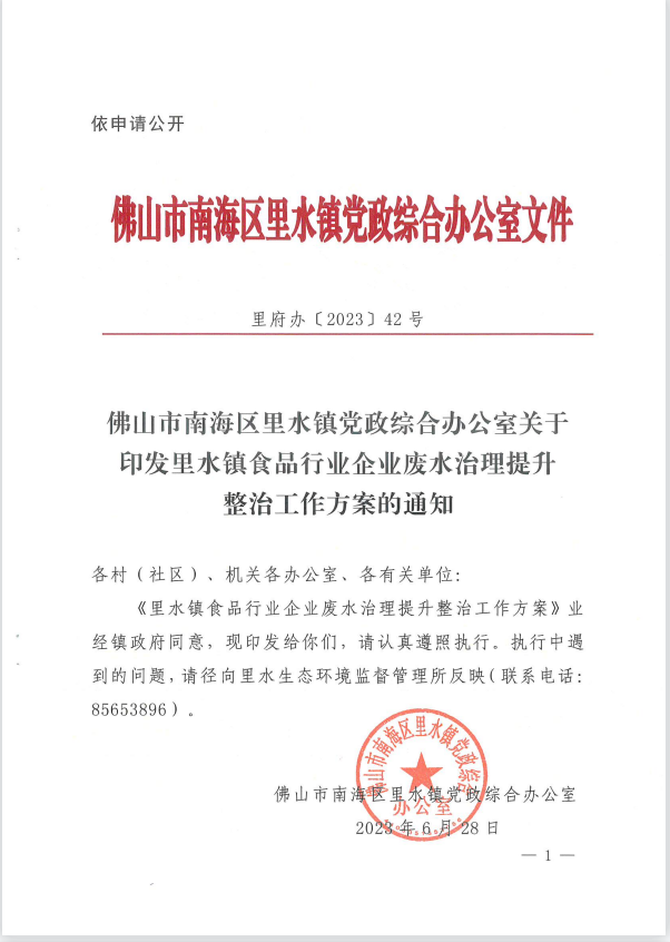 《里水镇食品行业企业废水治理提升整治工作方案》。