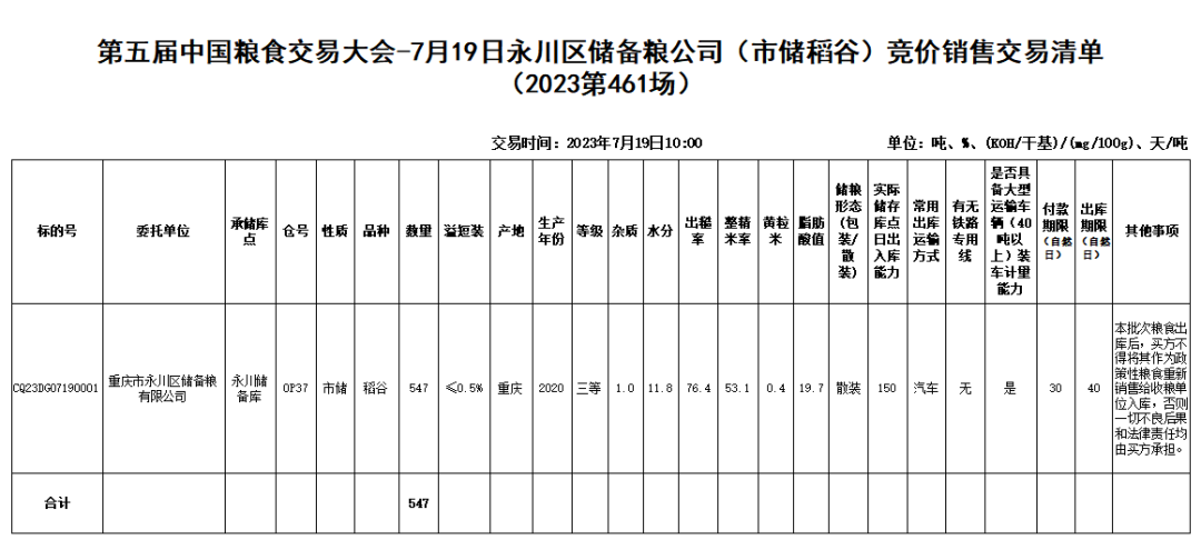 受重庆市永川区储备粮有限公司委托,重庆市粮油批发市场有限责任公司(即国家粮食重庆交易中心,以下简称“批发市场”)定于2023年7月19日10:00举办永川区储备粮公司(市储稻谷)竞价销售交易会,现将有关事项公告如下: