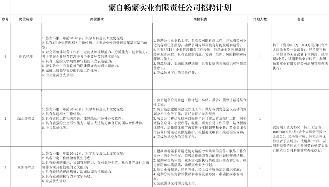 附件1:蒙自畅蒙实业有限责任公司招聘计划.xlsx