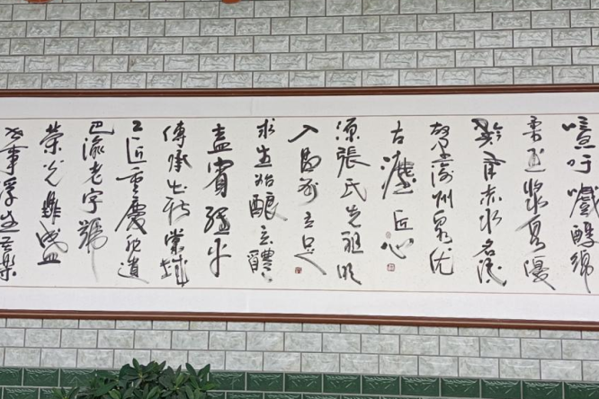 貌似不大的地盘,但走进酒坊,左侧开放的一块大水田,顿时便给人以轻松开阔的视野。右边墙上,则挂着一幅幅装裱上好的书法作品。于是,我们一群文学爱好者便齐刷刷地对墙上书法作品投去赞叹的目光,不时发出啧啧称赞,因为,那可都是荣昌书法名家的手笔。