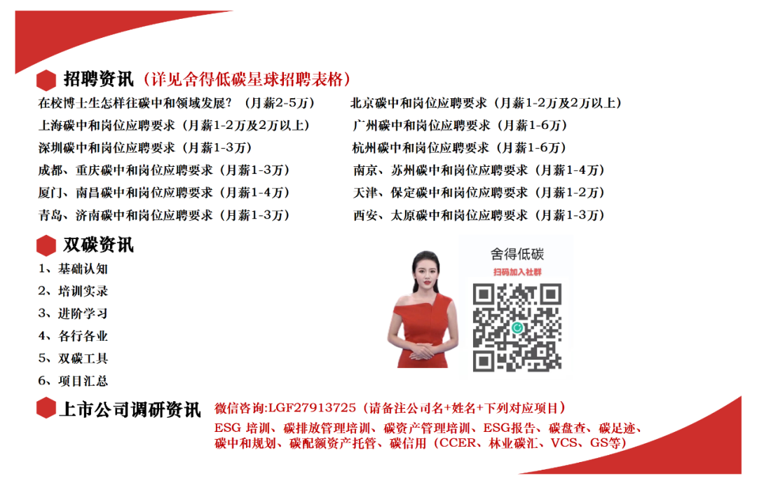 2、上市企业、各类园区:ESG报告、组织层面碳盘查、产品层面碳足迹、碳中和规划、碳配额资产托管、国内外碳信用申请和交易(CCER、林业碳汇、VCS、GS等)