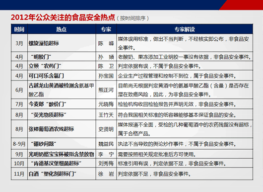 为了真实反映2012我国食品安全整体发展趋势,中国食品科学技术学会分别从食品安全专家与消费者两个层面对2012年我国发生的食品安全热点进行了梳理,并综合分析了各大门户网站新闻点击量、微博传播量、网帖评论量等相关数据筛选出12个热点内容。