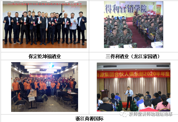 2008—2010年,应三得利酒业董事会多次邀请,为解决市场员工青黄不接的现状,及中高层管理员工技能欠缺的现实,临危受命为称为东北三大白酒销售巨头三得利酒业即龙江家园酒创建中低端白酒企业首家商学院,不仅仅解决了人员培训及输送的问题,更为关键的是支撑了企业连续三年业绩翻翻的战略规划的人才需求。