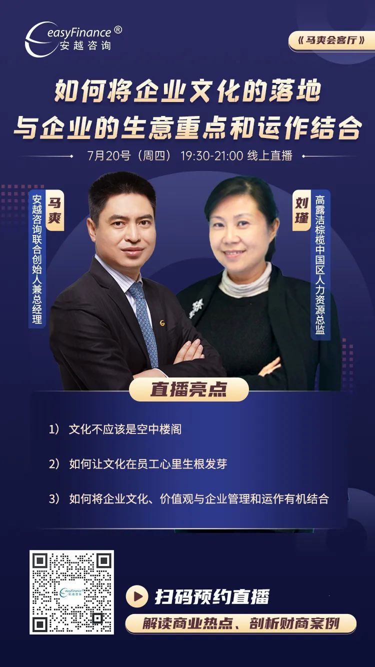 7月20日晚19:30,安越直播间马爽会客厅,安越咨询联合创始人兼总经理马爽邀请到高露洁棕榄中国区人力资源总监刘瑾女士,双方将以《如何将企业文化的落地与企业的生意重点和运作结合》为主题,探讨企业文化在企业发展不同阶段的作用,以及如何更好地实施企业文化,助力企业经营目标的达成,欢迎大家提前预约观看!
