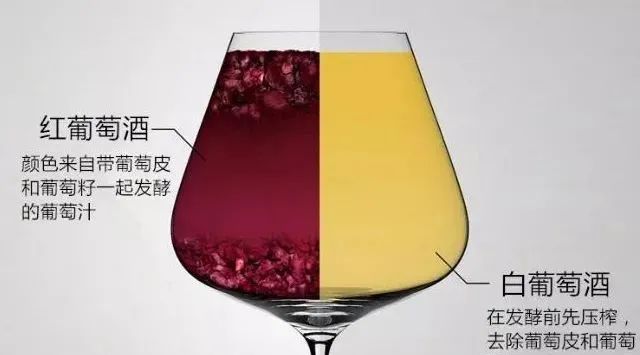 红葡萄酒颜色来自葡萄皮和葡萄籽一起发酵的葡萄汁;白葡萄酒在发酵前先压榨,去除葡萄皮和葡萄籽;桃红葡萄酒颜色介于红葡萄酒和白葡萄酒之间。