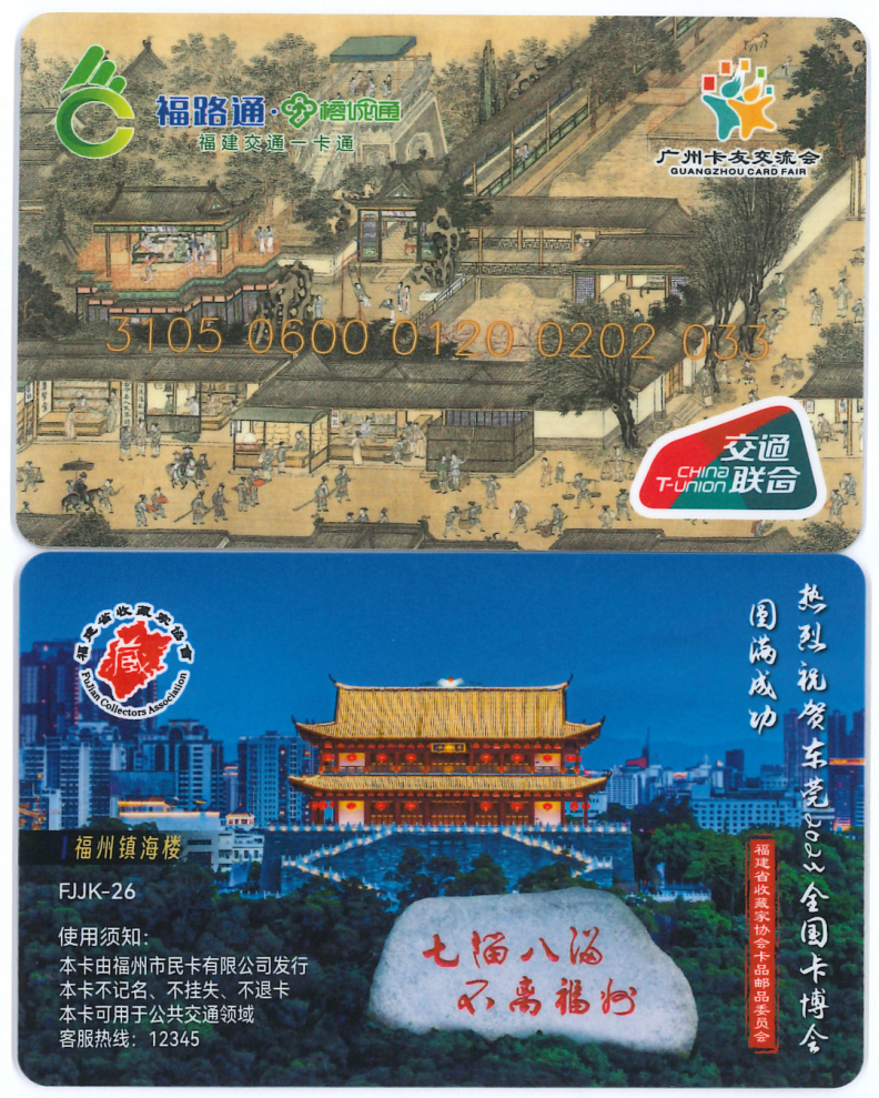 纪念卡背面,八大集卡组织不约而同选择了当地极具地域标志特色的古城墙楼阁照片,分别是北京紫禁城、上海豫园九曲桥,广州镇海楼、深圳大鹏所城、福州镇海楼、成都武侯祠三义庙、四平叶赫拉那古城和东莞可园,可谓是亭、台、楼、阁、轩、榭、廊、坊,尽显各地古色古香、古韵古风之美。其中福建省收藏家协会发行的纪念卡背面选用了“福州镇海楼”黄昏的景色,下方绿树成荫中拥抱着一块“七溜八溜不离福州”的书法石牌。其典故出自: