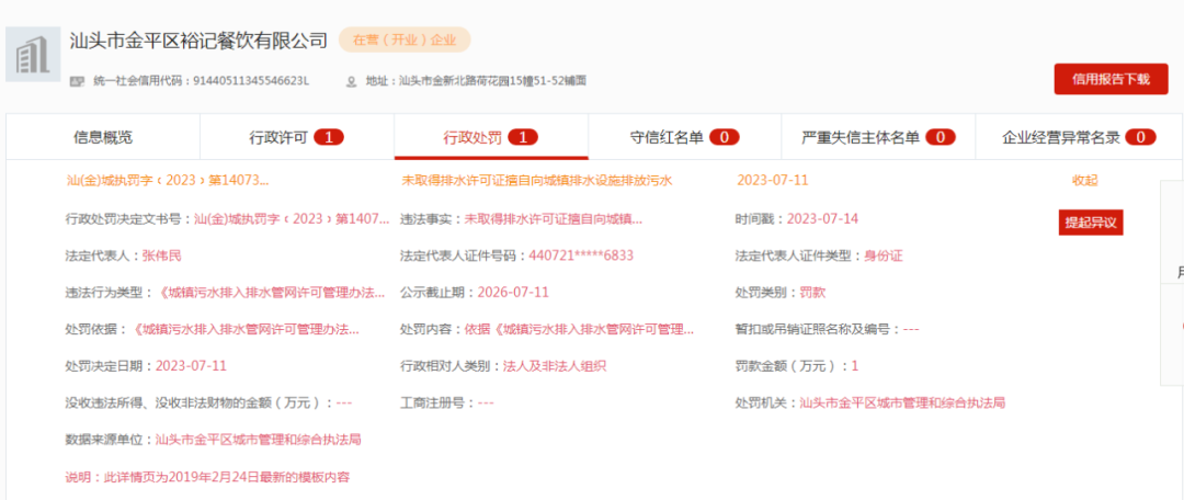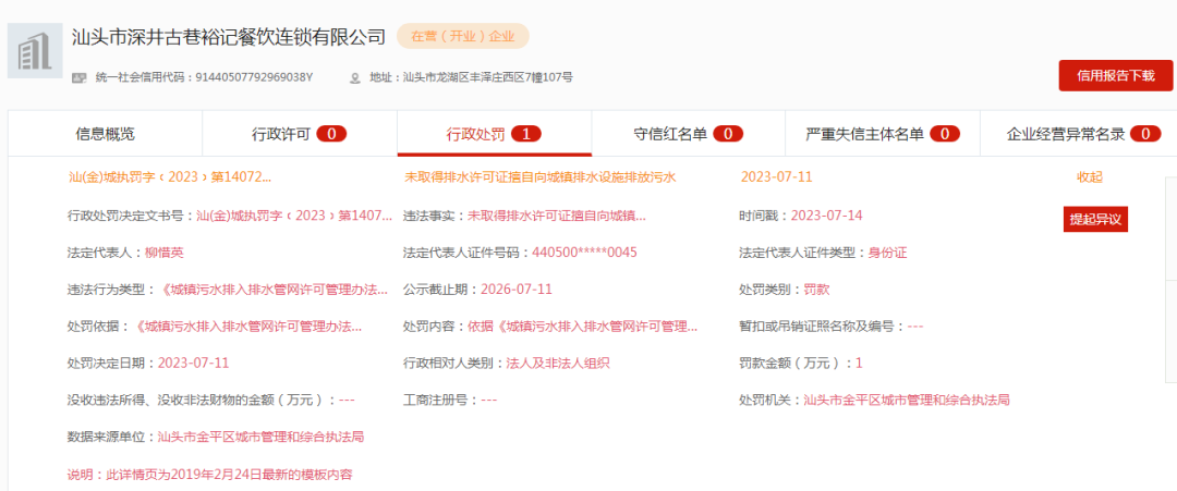 据信用中国官网公布的信息,汕头市深井古巷裕记餐饮连锁有限公司、汕头市金平区裕记餐饮有限公司均因未取得排水许可证擅自向城镇排水设施排放污水,依据《城镇污水排入排水管网许可管理办法》第二十六条的规定,决定分别予以罚款1万元整的行政处罚。