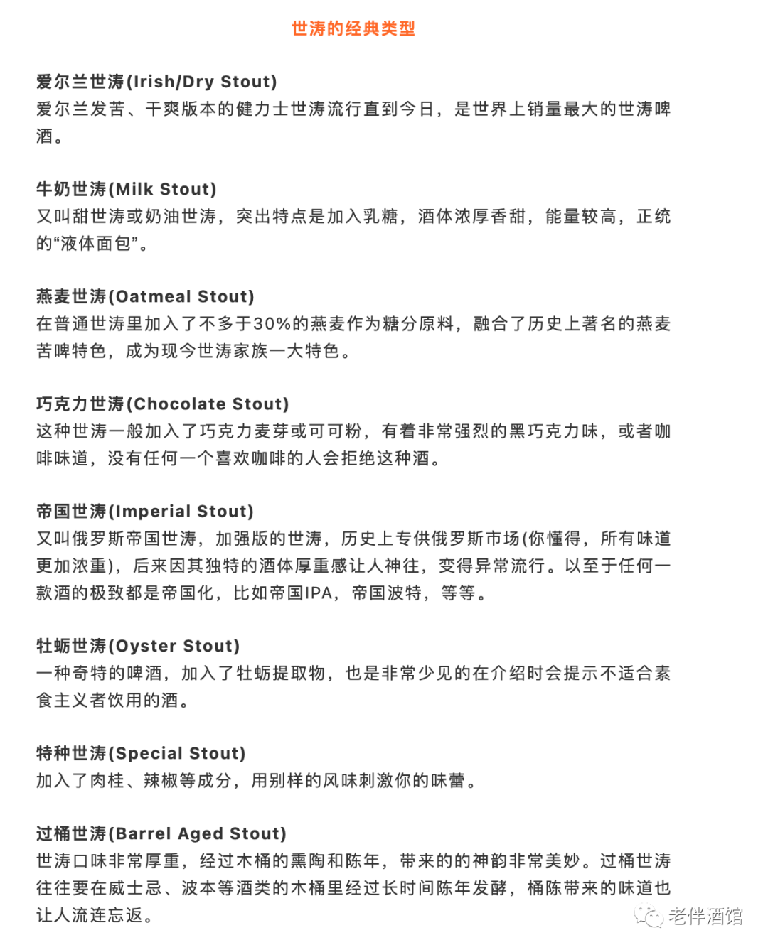 世涛啤酒本身就是由porter波特演变而来,Stout的英语本意就是烈性的、结实的,最经典的世涛就是爱尔兰世涛,波特啤酒传入爱尔兰后,开创性的使用大量烘焙过的深色麦芽来酿制,带来了咖啡或巧克力的浓郁香气,还有奶油般的口感,更受人们欢迎。