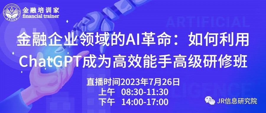 为此,金融培训家将于 2023年 7月 26日,线上直播 关于《金融企业领域的AI革命:如何利用ChatGPT成为高效能手高级研修班》活动。
