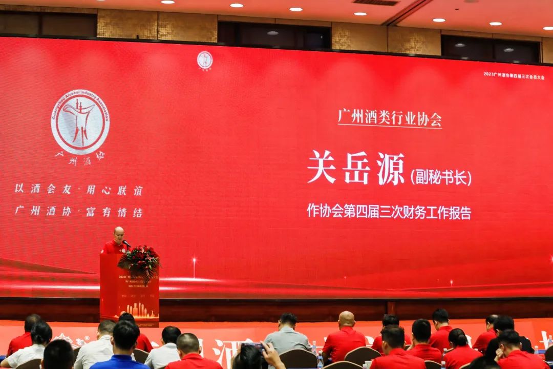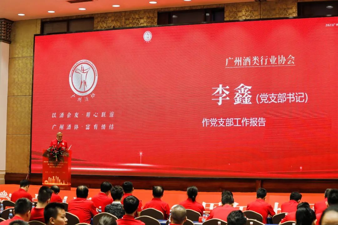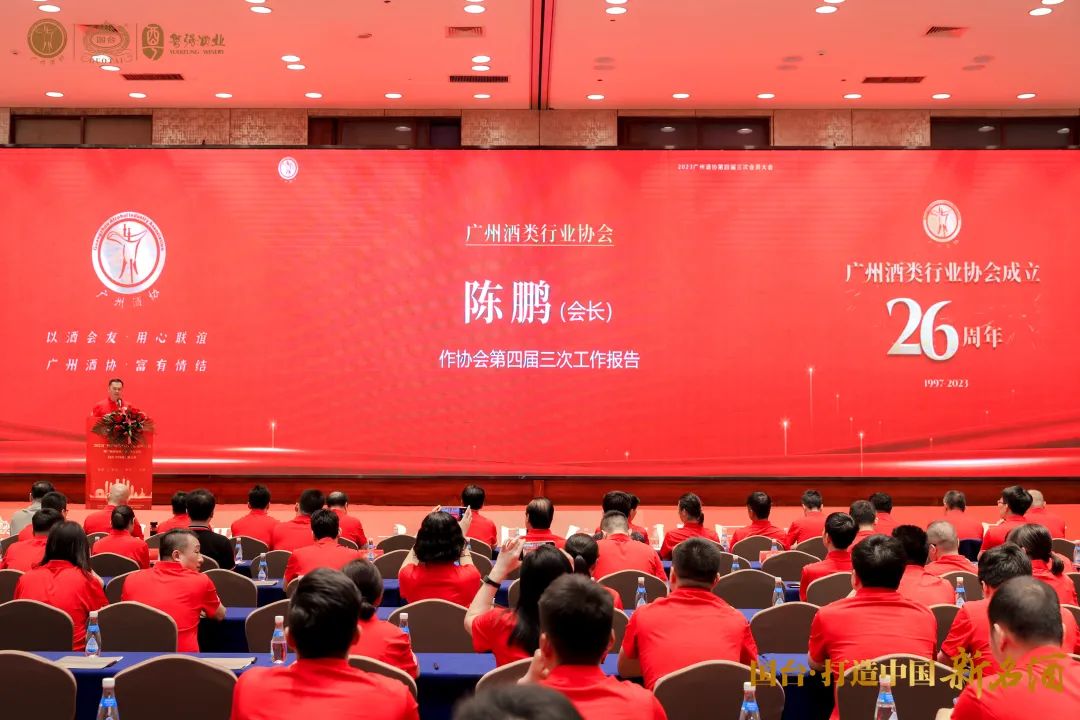 广州酒类行业协会会长陈鹏代表酒协作年度工作报告。报告从九个方面回顾了广州酒类行业协会主要工作: