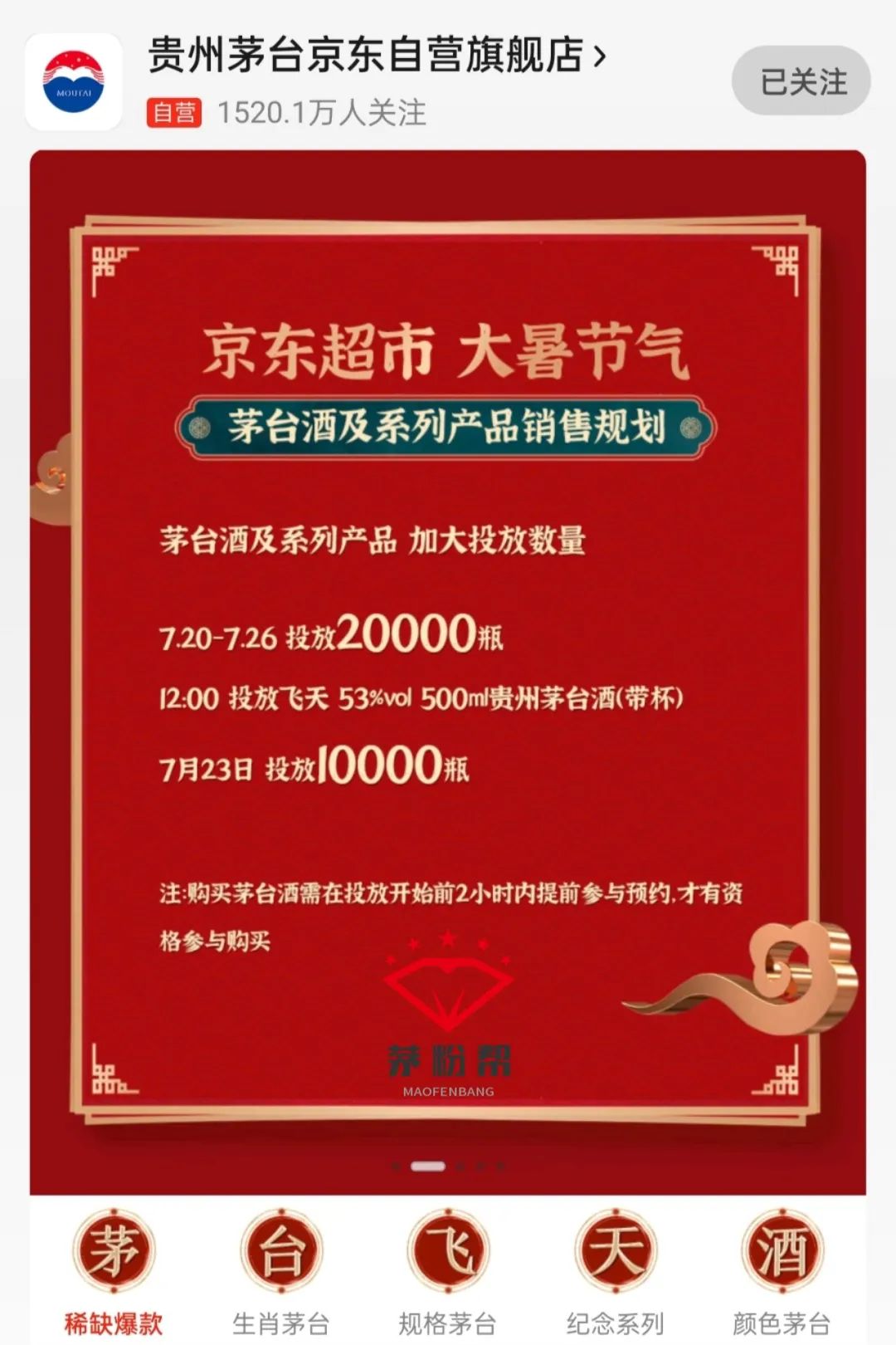 近日,为迎接大暑节气,贵州茅台京东自营旗舰店将加大投放茅台酒及系列产品数量,在7月20日至26日,茅台京东自营旗舰店将投放20000瓶飞天53%vol 500ml贵州茅台酒(带杯)。其中,7月23日将投放10000瓶。