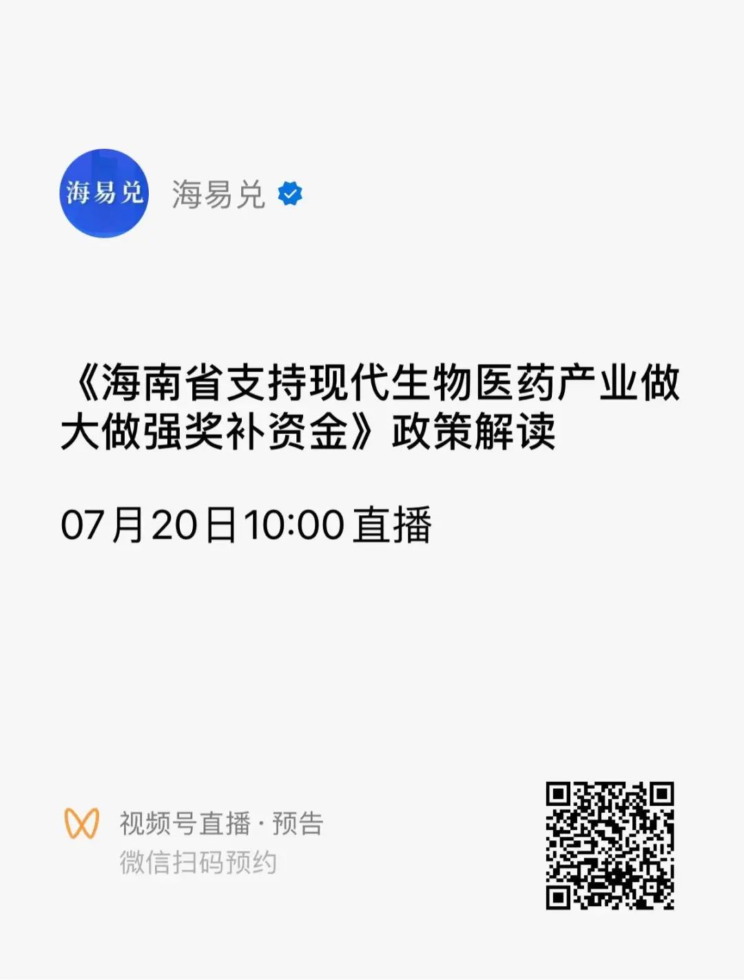 @所有企业,7月20日有一场《海南省支持现代生物医药产业做大做强奖补资金》直播等你查收!