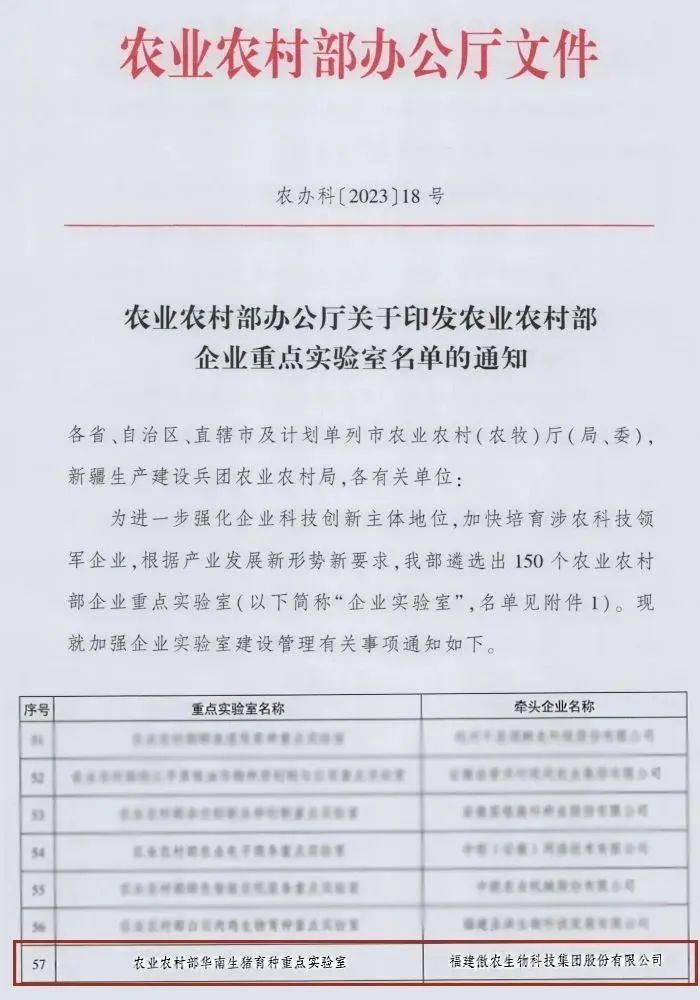 近日,农业农村部发文公布了“农业农村部企业重点实验室”名单,傲农集团成功获评“农业农村部华南生猪育种重点实验室”。