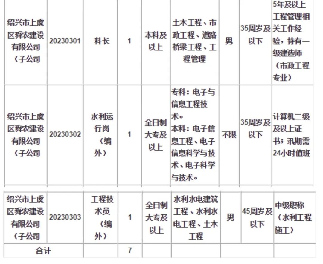 绍兴市上虞水利建设集团有限公司是经区政府批准成立的国有企业,为满足集团本级及下属子公司生产经营业务发展需要,现面向社会公开招聘合同制职工1名,编外员工2名。具体招聘事项公告如下: