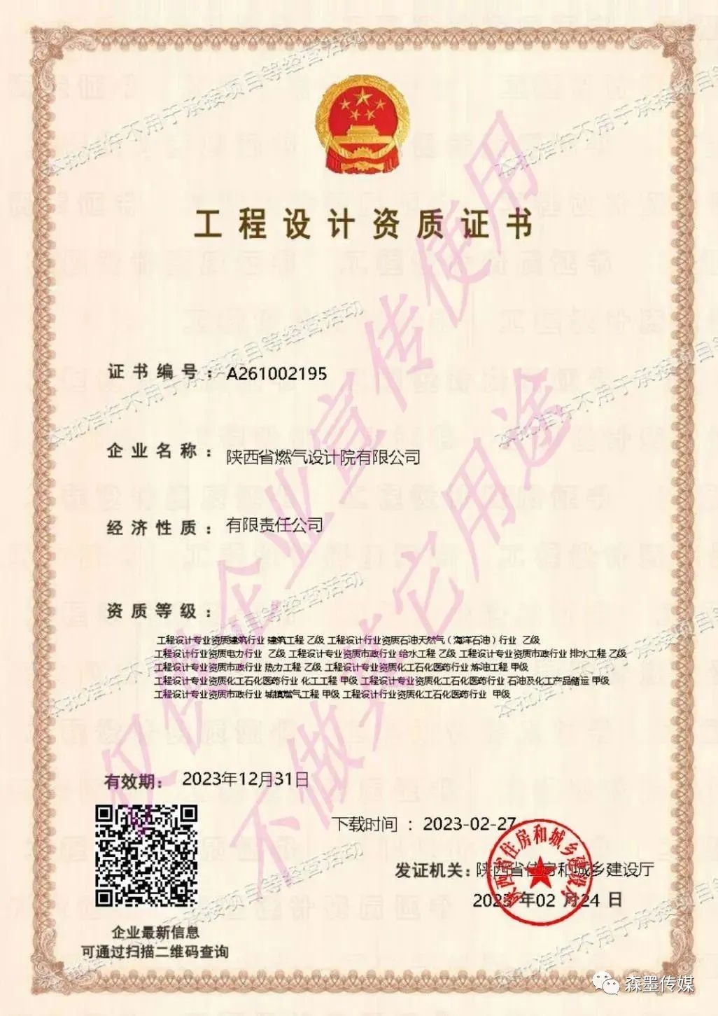 陕西省燃气设计院有限公司取得化工石化医药行业甲级设计资质