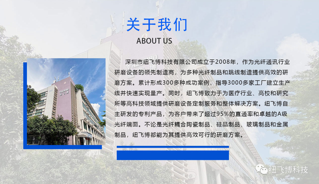 纽飞博专业研发设计团队秉持“持续改进、创新不止”的设计理念,智能保偏光纤对轴系统和多功能裸纤研磨设备为国内独家首创。经验丰富的技术团队拥有数百种有效的方法,能及时解决光纤线束制造商的端面缺陷和光连接接入损耗过大的技术难题,远程视频连线售后服务让用户永无后顾之忧。纽飞博坚持以客户为中心,应用新技术和新设计持续改进产品和提升服务,力争为客户创造更大的价值!电话:0755-86223060 13510636654(微信同号)地址:深圳市光明区凤凰街道汇业路8号汇业科技园4A栋408
