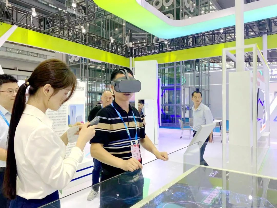 在现场,参观者不仅能通过讲解和模型了解零能耗建筑项目,还可通过佩戴VR眼镜,实现沉浸式参观南山能源生态园全貌。此外,集团展区还通过展板、视频等方式展示了三家参展企业的专业技术优势及核心亮点,如企业数字化智慧运营系统、新能源和常规能源投资建设运营、综合智慧能源一站式服务解决方案等。