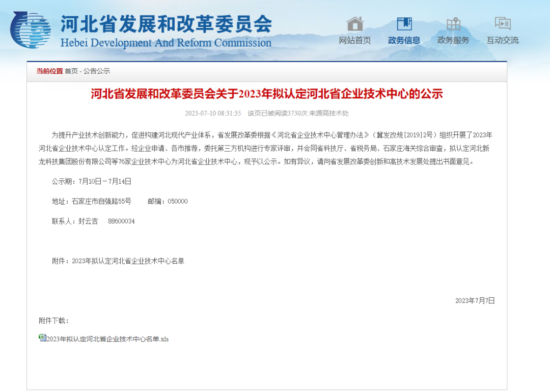 7月10日,河北省发改委发布《河北省发展和改革委员会关于2023年拟认定河北省企业技术中心的公示》。公示显示,河北翔金超环保科技有限公司成功入选2023年河北省企业技术中心,名列第13位。