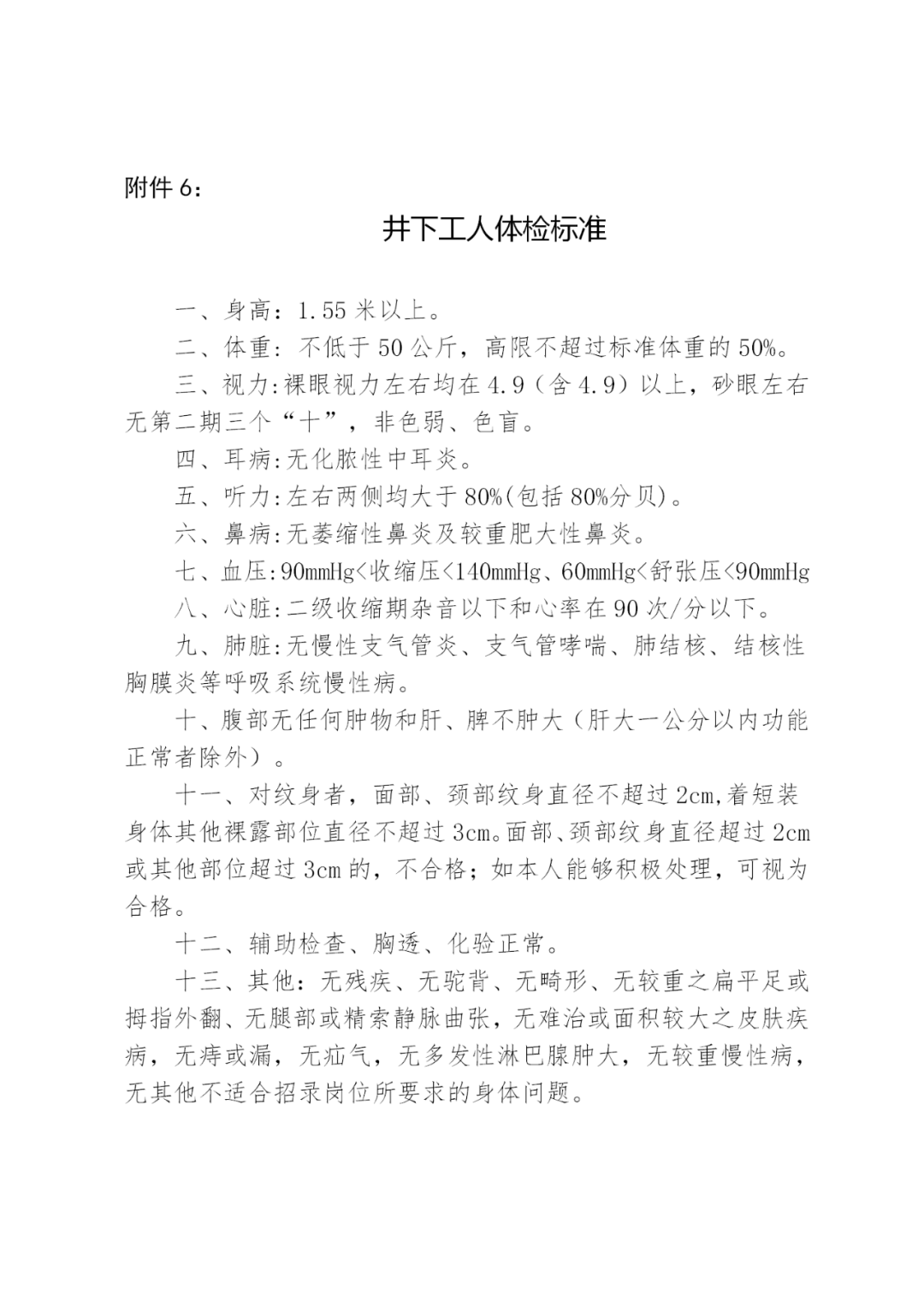 4、身体健康,符合《煤矿井下工人体检标准》(见附件6),无职业病史,能够适应相应岗位工作。