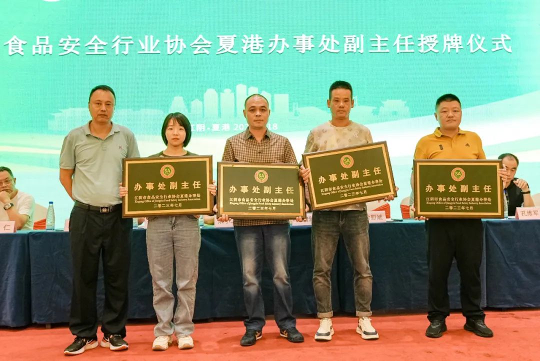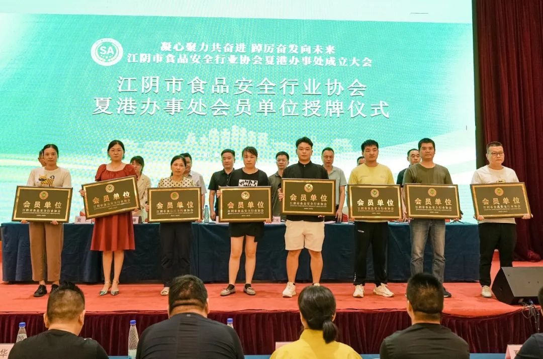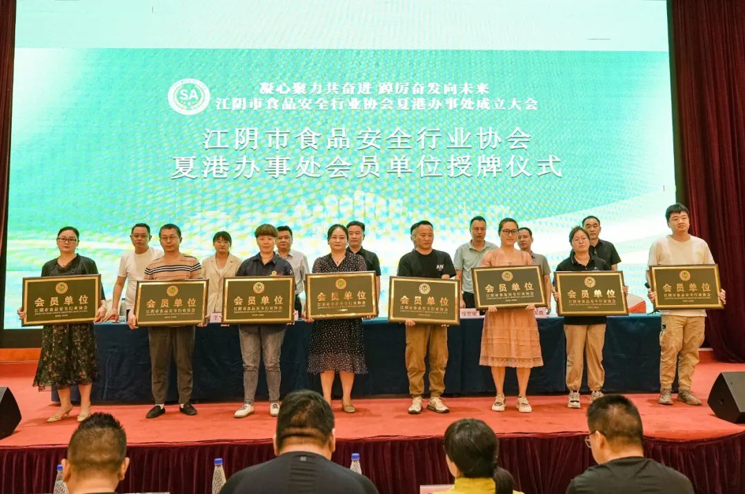 ▲夏港街道办事处主任徐韶润、江阴市市场监督管理局副局长黄新栋共同为江阴市食品安全行业协会夏港办事处揭牌▲临港开发区社会事业管理局局长朱小卫为协会夏港办事处主任蒋飞授牌▲江阴市食品安全委员会办公室专职副主任徐慰斌为协会夏港办事处副主任江阴正源大酒店有限公司徐汀、江阴欧亚商务酒店管理有限公司蒋建伟、夏港重庆烧鸡公餐饮店吴治建、江阴华澄餐饮管理有限公司刘小卫授牌▲江阴市市场监督管理局临港分局副局长丁国良为协会夏港办事处理事单位授牌▲为江阴市食品安全行业协会夏港办事处会员单位授牌