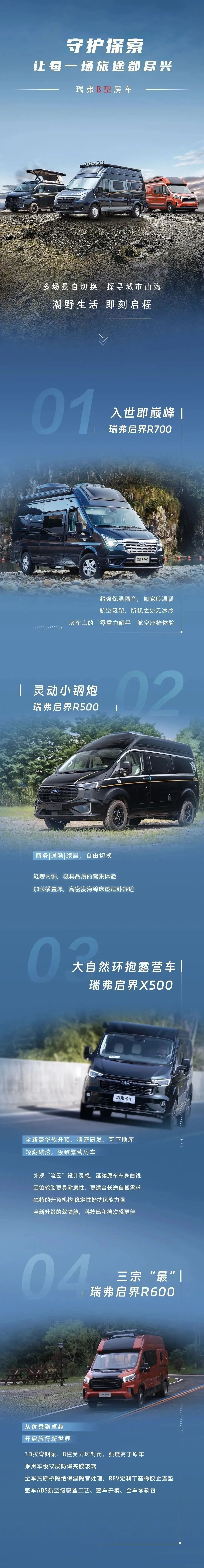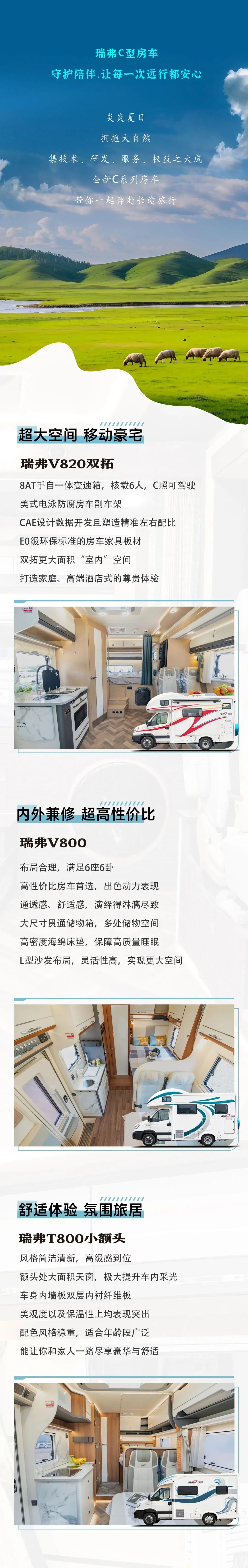本次亮相的有V820、V800、T800、R500、R600等系列车型。C型系列基于依维柯欧盛底盘,除了底盘承载性、通过性、舒适性极佳的优势外,采用了轻量化家具,EO级环保板材打造,让您的居住环境温馨典雅的同时也更安全;B型系列以灵动的外观与稳定的性能著称,以媲美乘用车标准打造,搭配高端商旅风格的内装,既能享受旅居出游的乐趣,还能兼顾商务和通勤使用。