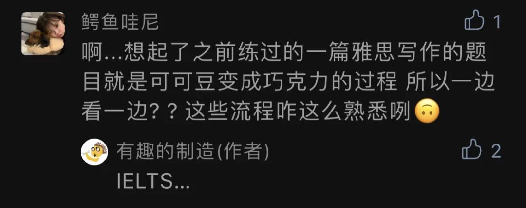 后来在《新鲜的可可豆怎么处理,才能做成巧克力? | 有趣的制造》中,也有小可爱惊呼梦魇…还是说,只有我这种学渣才光想一想就会心跳加速?我也多么希望考的内容正好是我熟悉的制作流程啊!