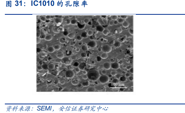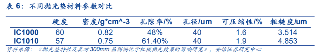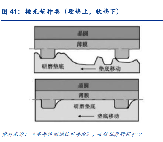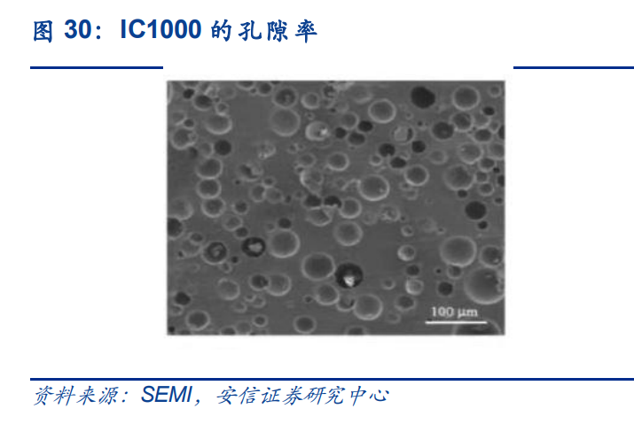 ►软垫:抛光液利用率高,抛光液中固体颗粒较小,有更好的硅片内平均性, 因此可以增加光洁度, 同时去除粗抛时留下的损伤层,但难以实现高效的平坦化加工高硬度抛光垫容易造成晶圆刮伤导致低的良率,较软的抛光垫则有更高的损耗率,因而通过改变化学成分与多孔结构控制,根据工艺需求选择特定硬度的抛光垫是抛光垫环节的工艺难点。在硬垫领域过去制程演进的过程中不同的技术节点对于抛光垫的变化不是非常大,龙头公司相对容易保持产品的一致性、垄断性、和稳定性。