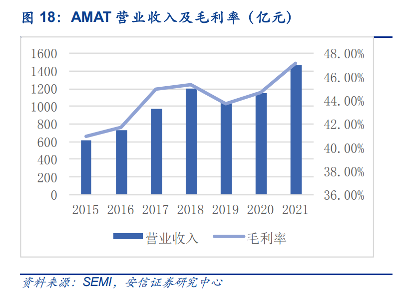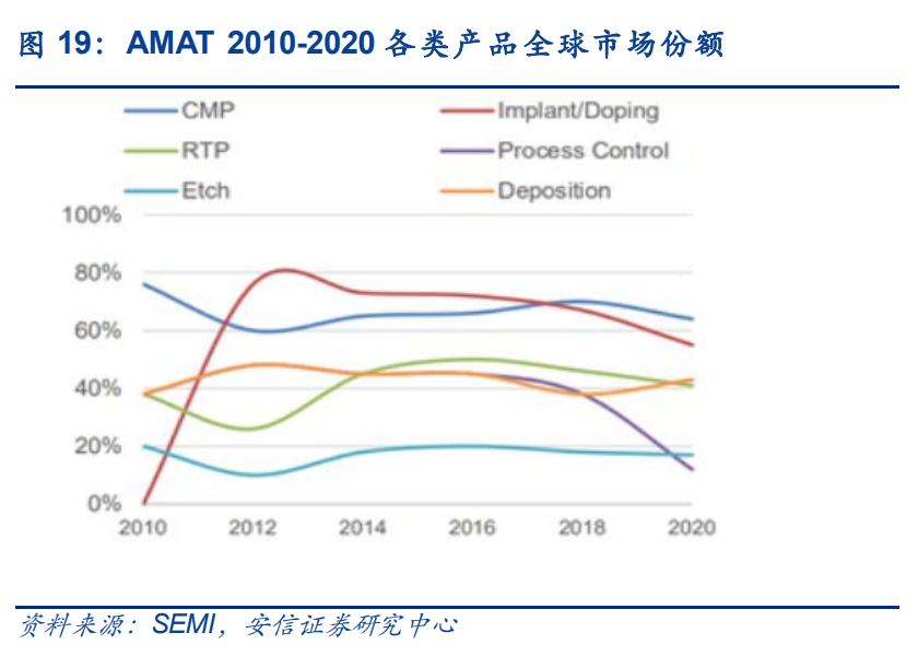 应用材料(AMAT)是全球最大的半导体设备供应商之一,业务涵盖半导体设备、太阳能、显示器、自动化软件、卷对卷真空镀膜等多个领域。在半导体设备业务版块,公司制定了PPACt 战略旨在通过并行而非串行的创新来推动芯片的能效、性能、面积、成本和上市时间革新。公司产品覆盖沉积、刻蚀、掺杂、CMP 多工艺环节。