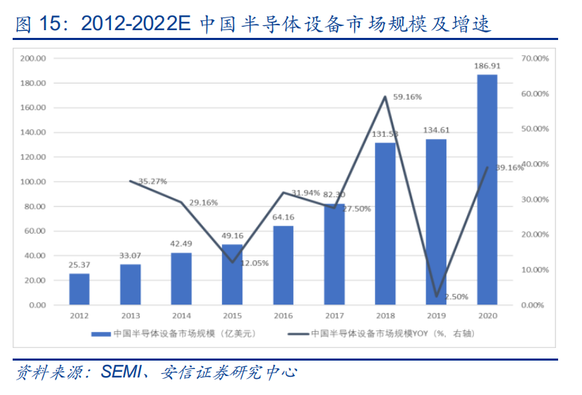 2021 年,中国大陆第二次成为全球半导体设备的最大市场,销售额增长了 58%,达到 296亿美元,在全球市场占比高达 28.7%,占比进一步提高。