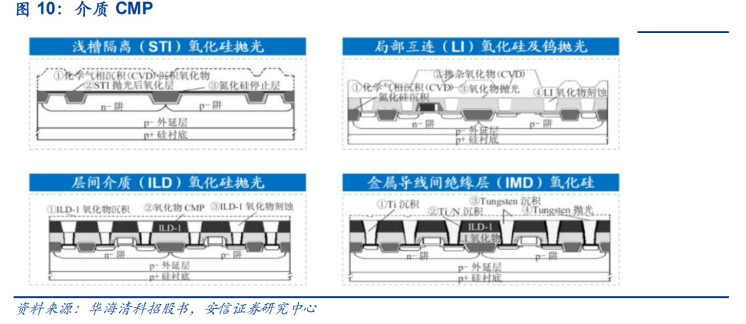 90~65nm 节点:随着铜互连技术和低 k 介质(一种绝缘材料)的广泛采用,浅槽隔离(STI)、 绝缘膜、铜互连层是 CMP 的主要研磨对象。