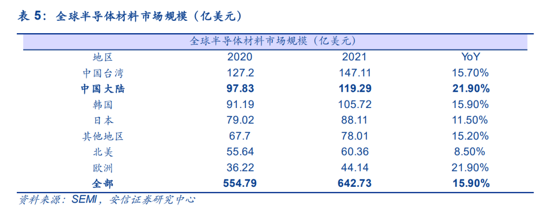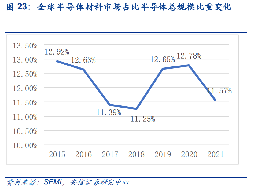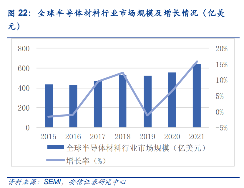 受益于晶圆厂积极扩产以及半导体工艺升级,半导体材料市场规模持续增长。据国际半导体产业协会(SEMI)发布数据显示,全球半导体材料市场规模始终保持在半导体总规模的11%-13%左右;2021 年全球半导体材料市场规模达 643 亿美元,较 2020 年的 555 亿美元增加 88 亿美元,同比增长 15.9%,再创新高。