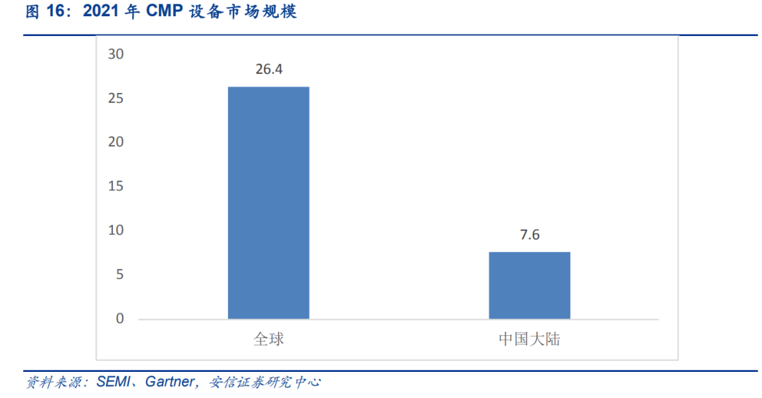 根据 Gartner 数据,CMP 设备在半导体晶圆制造设备中占比为 3%,结合 SEMI 的数据,2020-2021 年全球晶圆制造设备市场规模 612 亿美元、880 亿美元,按照 3%的比例测算,CMP 设备对应市场规模为 18.4 亿美元、26.4 亿美元。