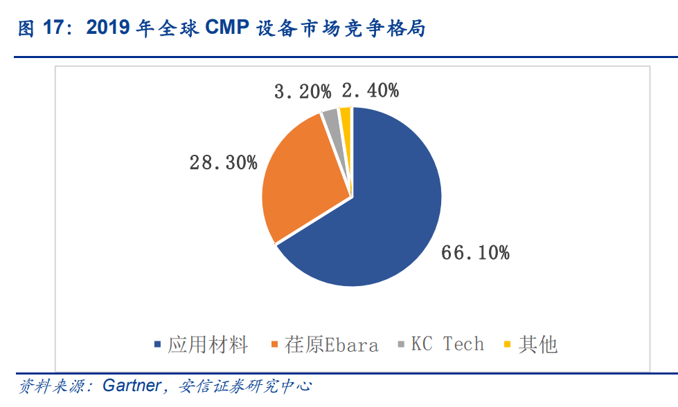 CMP 市场被海外垄断,市场集中度高。CMP 为多学科交叉,行业进入壁垒较高,整体产业呈日美企业垄断的格局。国内企业进入时间相对较晚,因此整体国产化率偏低。在 14nm以下最先进制程工艺的大生产线上所应用 CMP 设备仅由美国应用材料和日本荏原两家国际巨头提供。根据 Gartner 研究数据,2019 年美国应用材料和日本荏原的 CMP 设备销售额分别为 10.43 亿美元、3.725 亿美元,各占 70%、25%的全球市场份额。2017、2018、2019 三年,两家公司合计占有的市场份额分别为 98%、90%、95%,CMP 设备市场呈现出高度垄断的竞争格局。