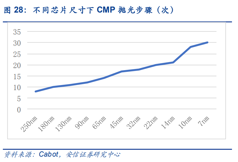 1)逻辑芯片中,制程的缩小带动 CMP 工艺步骤增加。晶圆在生产过程根据不同工艺制程和技术节点的要求,会经历几道至几十道不等的 CMP 工艺步骤。随着制造工艺节点的缩小,对逻辑芯片平坦化程度要求提高,演进出的先进逻辑芯片工艺抛光材料提出新需求,CMP步骤增加,CMP 材料需求量增大。据 Cabot 披露,先进制程 7nm 工艺的 CMP 步骤为 30步,成熟制程 90nm 工艺 CMP 步骤为 12 步,抛光次数倍数级增长,制程节点的进步推动 CMP 抛光材料需求量的增长。