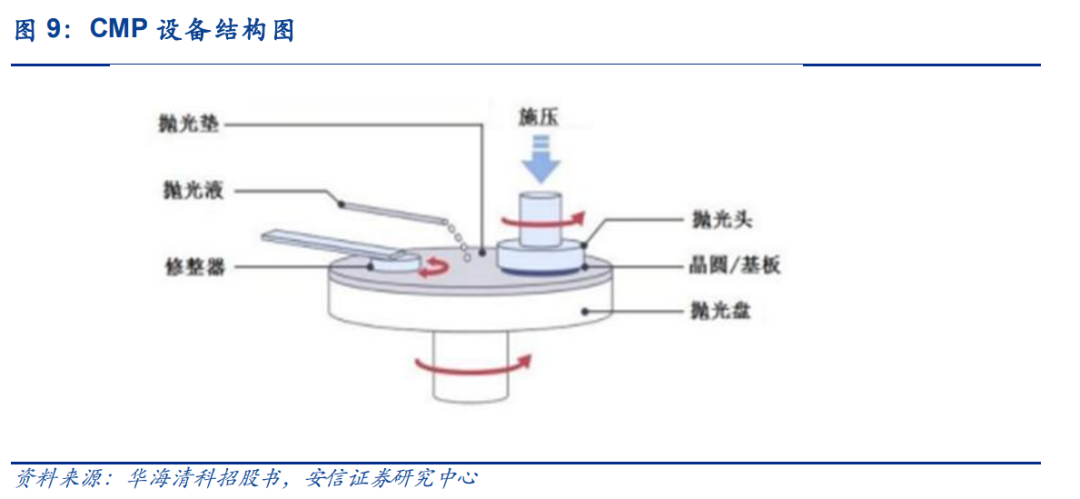 国内 CMP 设备的主要研发生产单位有华海清科等。华海清科是国产 12 英寸和 8 英寸 CMP 设备的主要供应商,是目前国内唯一实现了 12 英寸CMP 设备量产销售的半导体设备供应商。