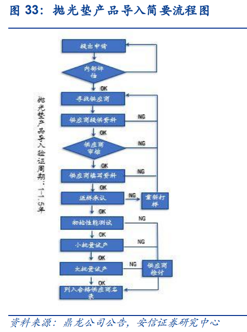 半导体器件对良率有极高的要求,一旦形成稳定的供应链体系,晶圆厂一般不太更换供应商。抛光垫对芯片良率影响较大,但成本占比较相对较低,晶圆厂在替换过程中的潜在损失机会成本较大,替换动力较小。抛光液技术含量高,下游客户对其实施严格的供应商认证机制,进行严格的供应商认证和定期考核。进入晶圆厂供应链体系需要经过审核、送样、测试等长达 2-3 年的认证环节。因此,行业巨头一般具有比较稳定的下游客户,容易形成市场垄断。严格来说,半导体材料行业属于成熟产业,各领域集中度高,由少数几个龙头企业占据绝大部分市场,国内仅安集科技、鼎龙股份等极少数企业参与竞争。