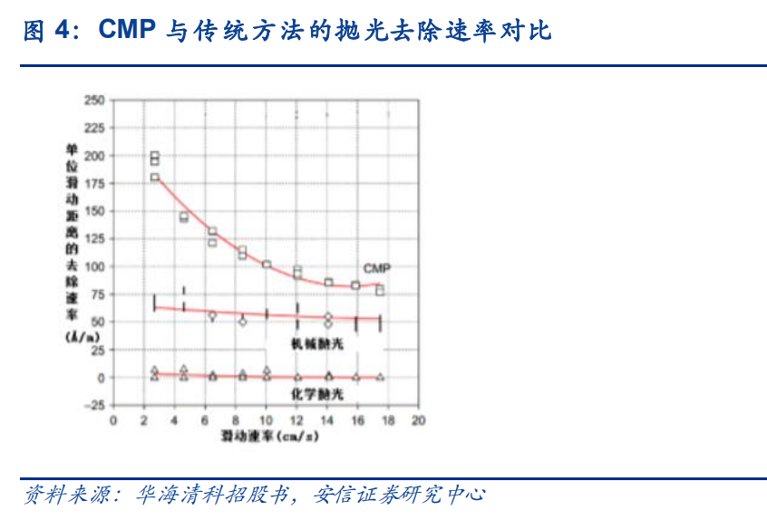 CMP(化学机械抛光)相较于传统方法有更高的加工精度和加工速度。传统的机械抛光和化学抛光方法,去除速率、抛光质量均无法满足先进芯片量产需求。而 CMP 技术利用磨损中的“软磨硬”原理,即用较软的材料来进行抛光以实现高质量的表面抛光,避免了由单纯机械抛光造成的表面损伤和由单纯化学抛光易造成的抛光速度慢、表面平整度和抛光一致性差等缺点,是目前唯一能兼顾表面全局和局部平坦化的抛光技术,在先进集成电路制造中被广泛应用。