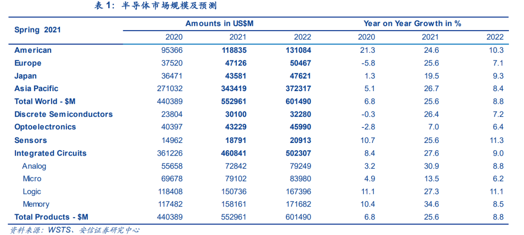 在 5G、物联网、汽车电子、云计算等需求的带动下,半导体市场需求持续增长。2020 年尽管受到疫情的影响,全球半导体市场规模依然同比增长 6.8%,达到了 4404 亿美元,预计 2021 年、2022 年全球半导体市场规模分别为 5530 亿美元、6015 亿美元,同比分别增长25.6%、8.8%。从分地区来看,2021 年和 2022 年亚太市场规模增速将高于全球平均,分别为 26.7%、8.4%,在全球市场的占比分别为 62.11%、61.90%。