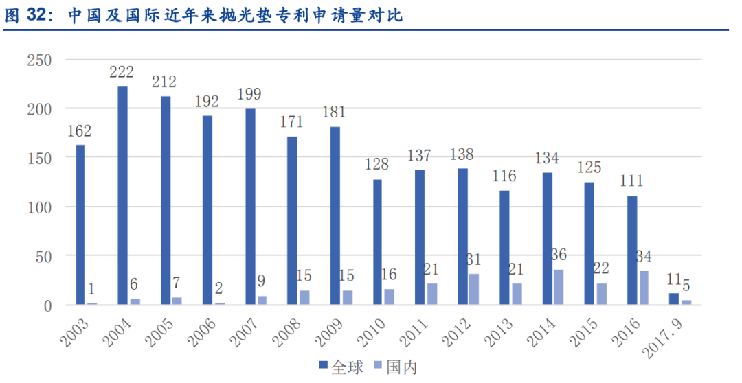 抛光垫是 CMP 工艺中重要耗材之一,但由于国内企业在化学机械抛光领域起步较晚,专利 技术积累相对较浅。代表未来趋势的 12 英寸晶圆用的开窗口抛光垫专利被美国公司占有, 国内仅有 DOW 获得授权生产销售。据《集成电路制造业用高分子聚合物抛光垫专利分析》 数据,2003-2009 年为国际申请数量高峰时段,2010 年后数量有所下降,但总体变化平稳, 抛光垫领域仍然是各个公司重点攻略方向。国内专利申请数量于 2008 年逐步攀升,在之后 呈现出波浪式上升的趋势。