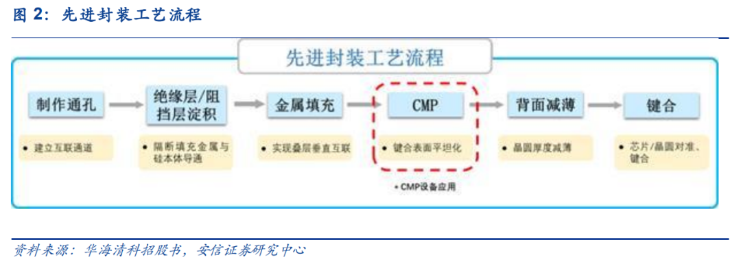 在后道封装领域:CMP 工艺也逐渐被用于先进封装环节的抛光,如硅通孔(TSV)技术、扇出(Fan-Out)技术、2.5D 转接板(interposer)、3D IC 等封装技术中对引线尺寸要求更小更细,因此会引入刻蚀、光刻等工艺,而 CMP 作为每道工艺间的抛光工序,也得以广泛应用于先进封装中。