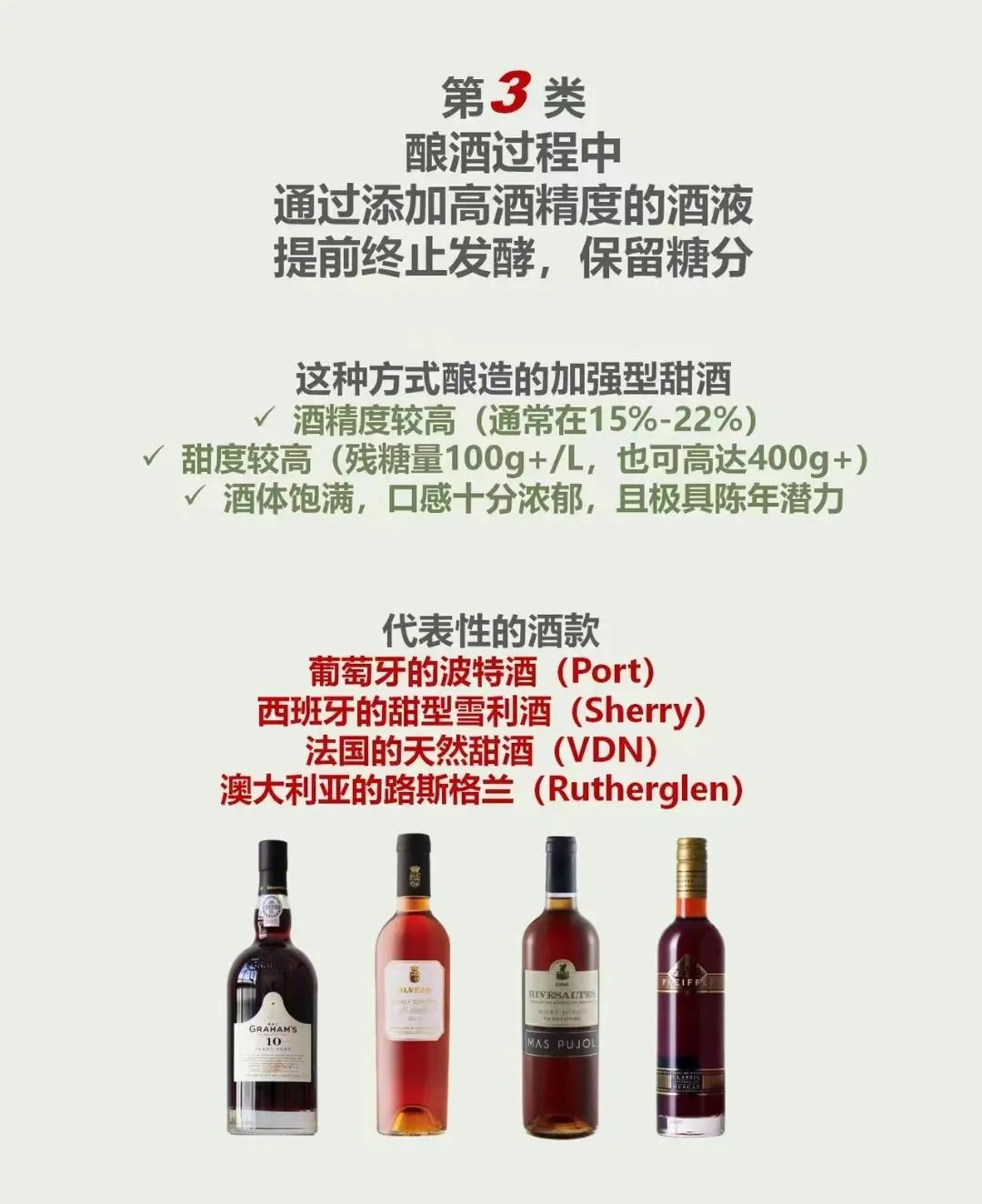 第三类:通过添加高酒精度的酒液提前终止发酵,保留糖分❣️这种方式酿造的加强型甜酒,酒精度数较高(15%-22%),甜度也较高;❣️这类甜酒的风格特点:酒体饱满、口感十分浓郁、且极具陈年潜力