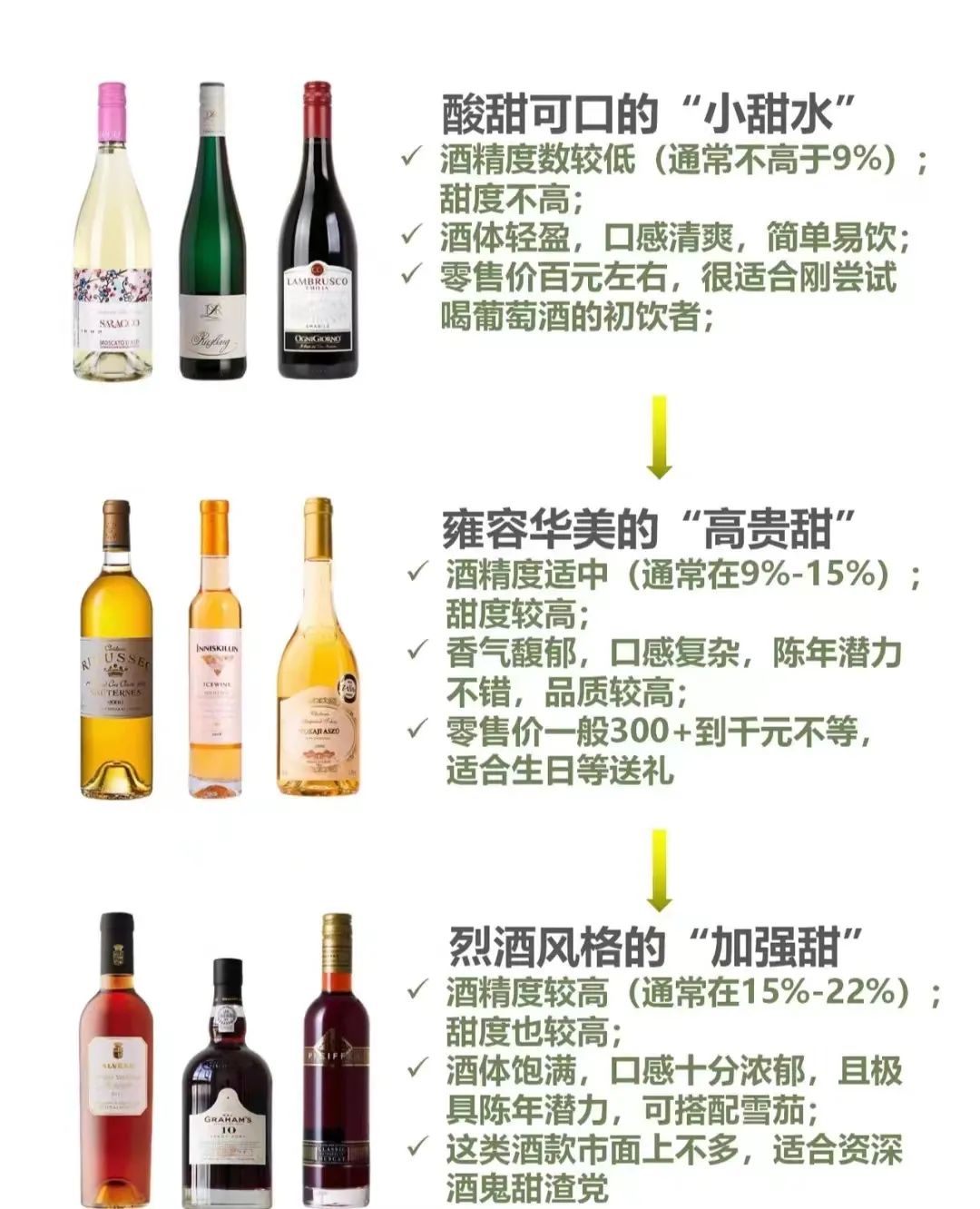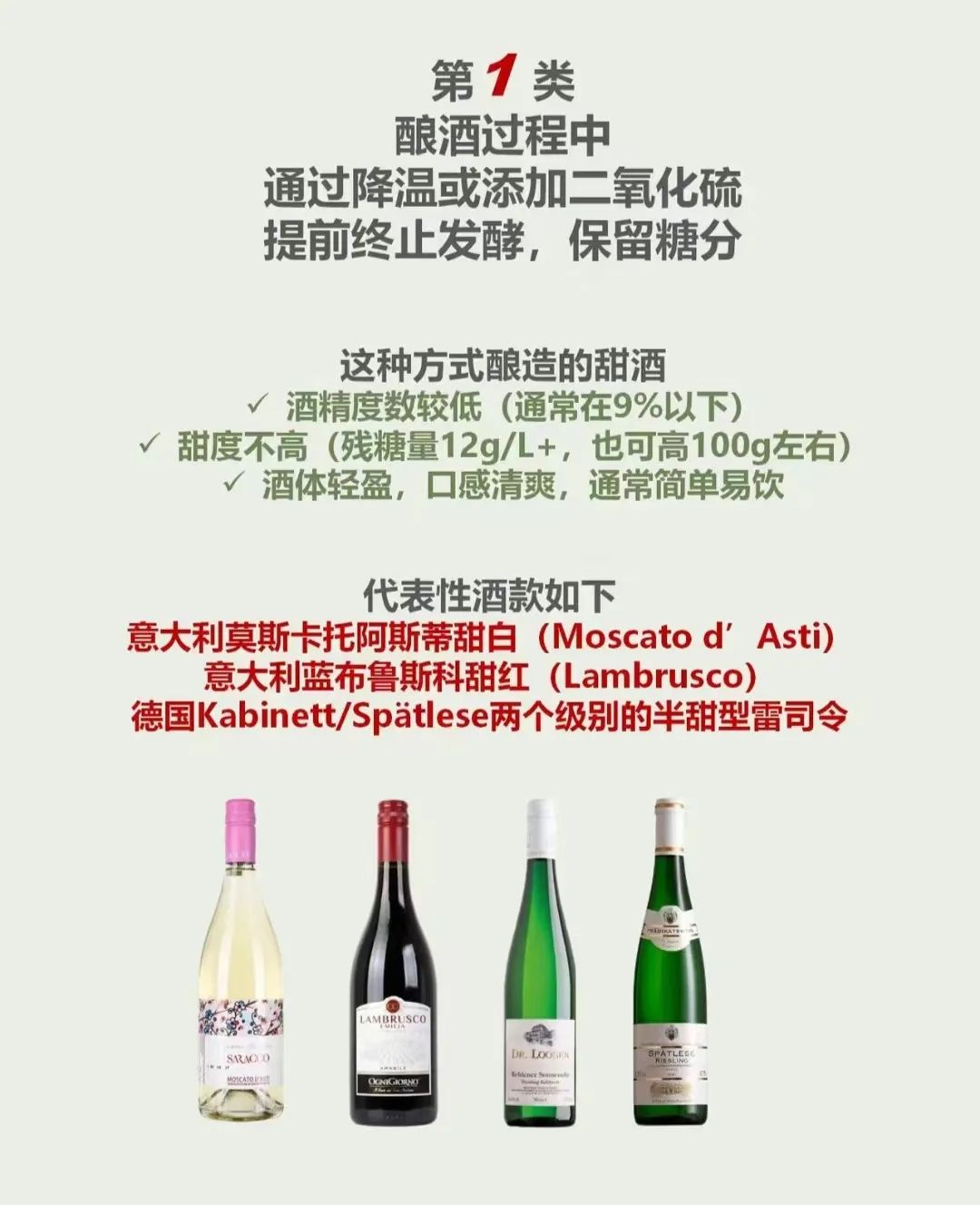 第一类:通过降温或添加二氧化硫提前终止发酵,保留糖分这种方式酿造的甜酒,酒精度数较低(通常在9%以内),甜度也不高;这类甜酒的风格特点:酒体轻盈、口感清爽、通常简单易饮用;
