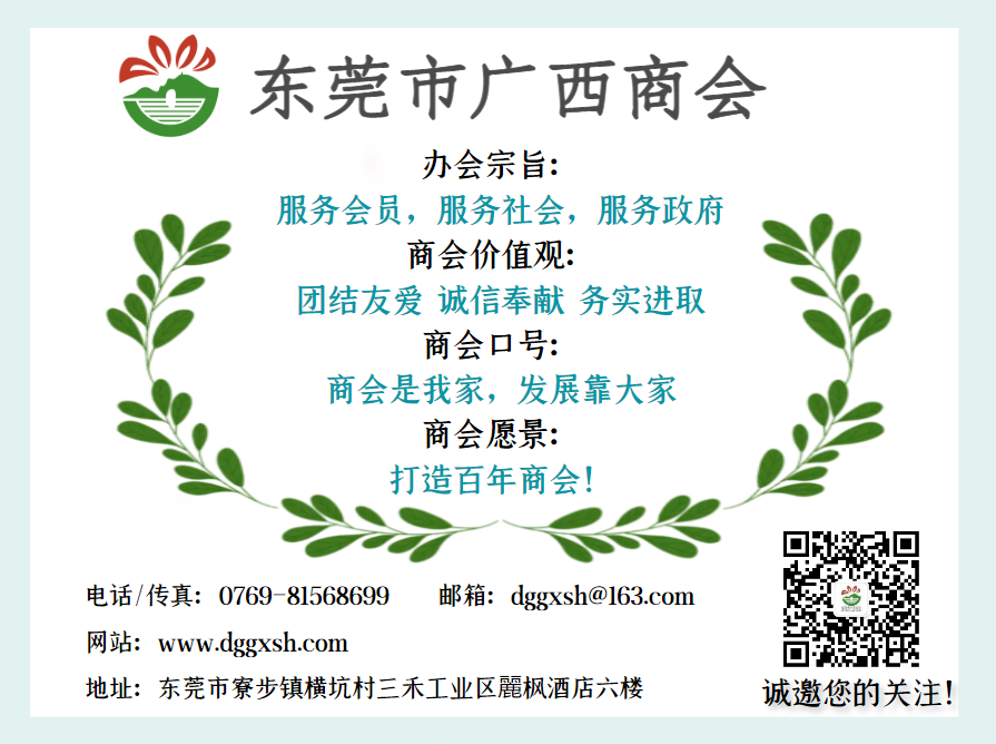 本微信公众号为东莞市广西商会所有,如公众号的文章标题、内容、图片及视频涉及版权或其它问题,请及时与本会联系,我们将在第一时间修改或删除,东莞市广西商会拥有对此声明的最终解释权。
