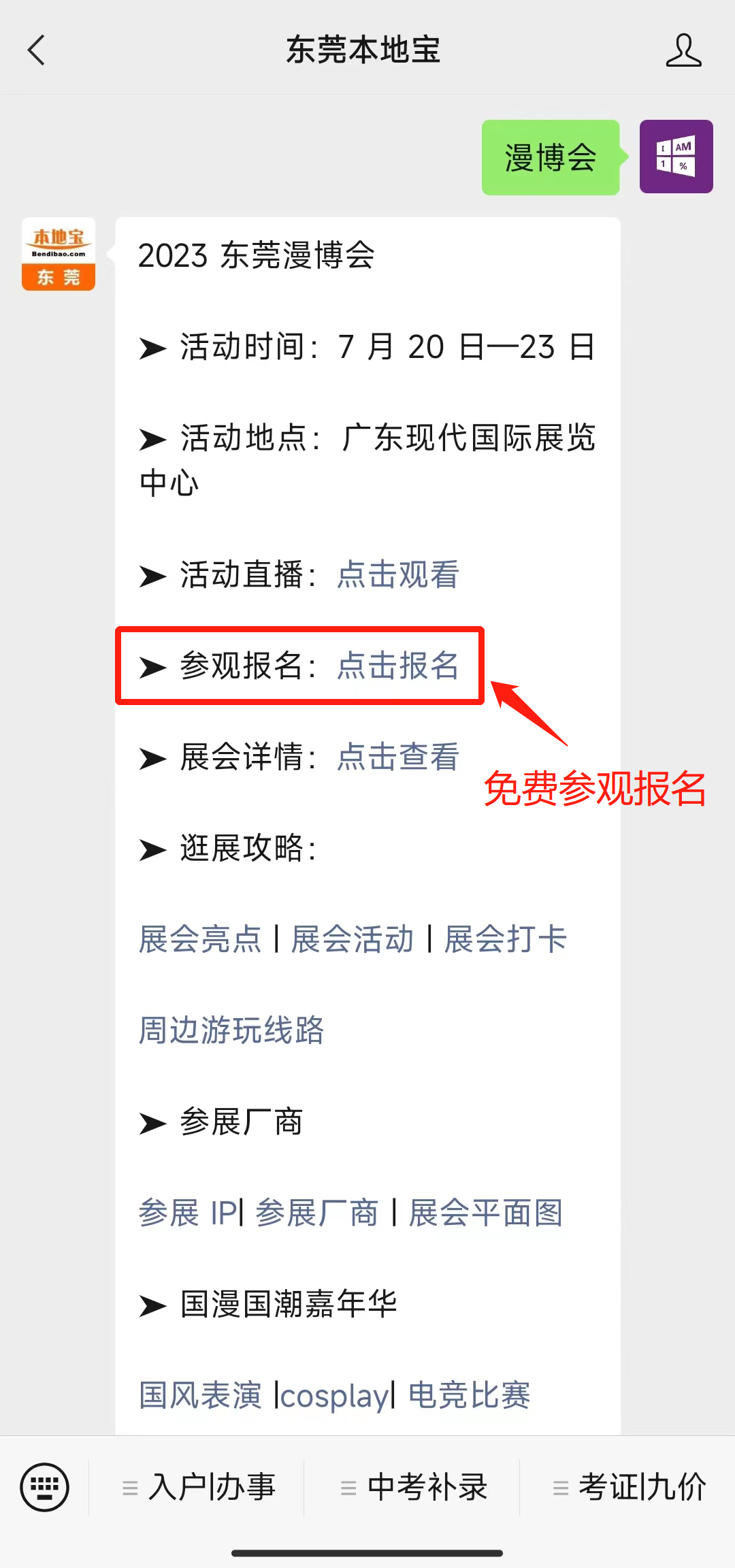点击下方公众号名片,关注【东莞本地宝】微信公众号,在聊天对话框回复【漫博会】即可获取预约入口。