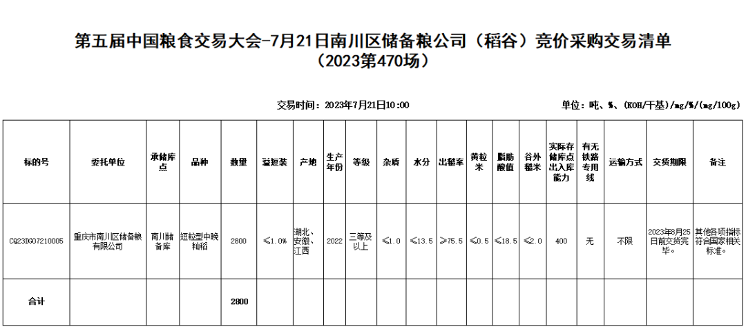 受重庆市南川区储备粮有限公司委托,重庆市粮油批发市场有限责任公司(即国家粮食重庆交易中心,以下简称“批发市场”)定于2023年7月21日10:00举办南川区储备粮公司(稻谷)竞价采购交易会,现将有关事项公告如下: