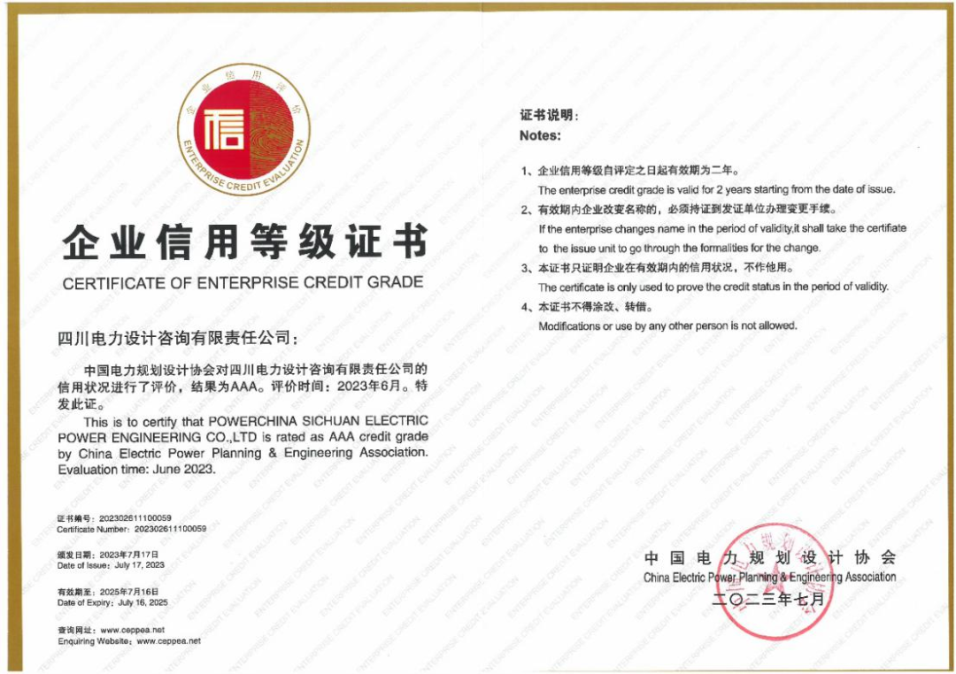 全国电力勘测设计行业企业信用等级评价,主要从企业的价值理念、制度规范、品牌形象、管理能力、财务能力、市场能力、公共管理、相关方履约、公益支持等方面对企业的信用状况和信用能力进行综合性评价。AAA级信用等级的保持,不仅代表了公司实力和信誉度,也是对公司诚信经营行为的肯定,为公司开拓市场、实现规模与效益同步增长起到积极的促进作用。