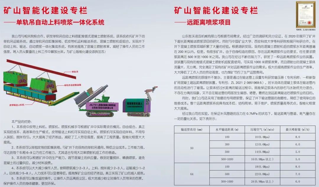 为响应国家智能化矿山建设,我公司成功研发智能喷浆机器人、远程遥控喷浆机,可实现远距离控制上料、喷浆一体化,真正实现了减人提效,大大提高了井下喷浆智能化程度。截止2022年底,本公司已与全国500余个煤矿企业建立了业务往来关系。